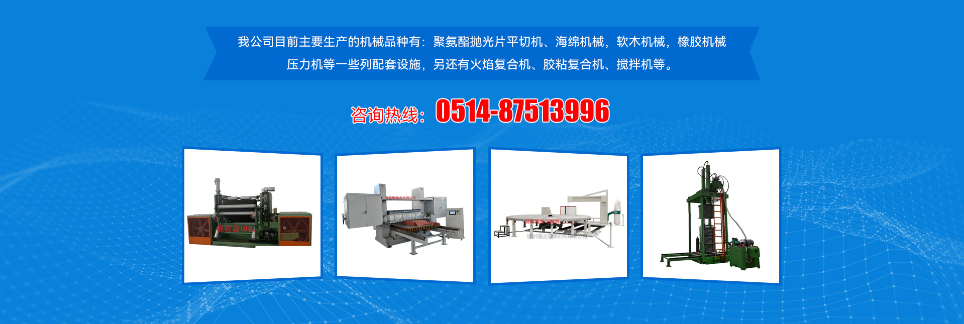 我公司目前主要生产的机械品种有:聚氨酯抛光片平切机、海绵机械(平切机、旋切机、打孔机、立切机),软木机械(平切机、旋切机)橡胶机械(平切机、旋切机、刨切机)压力···...